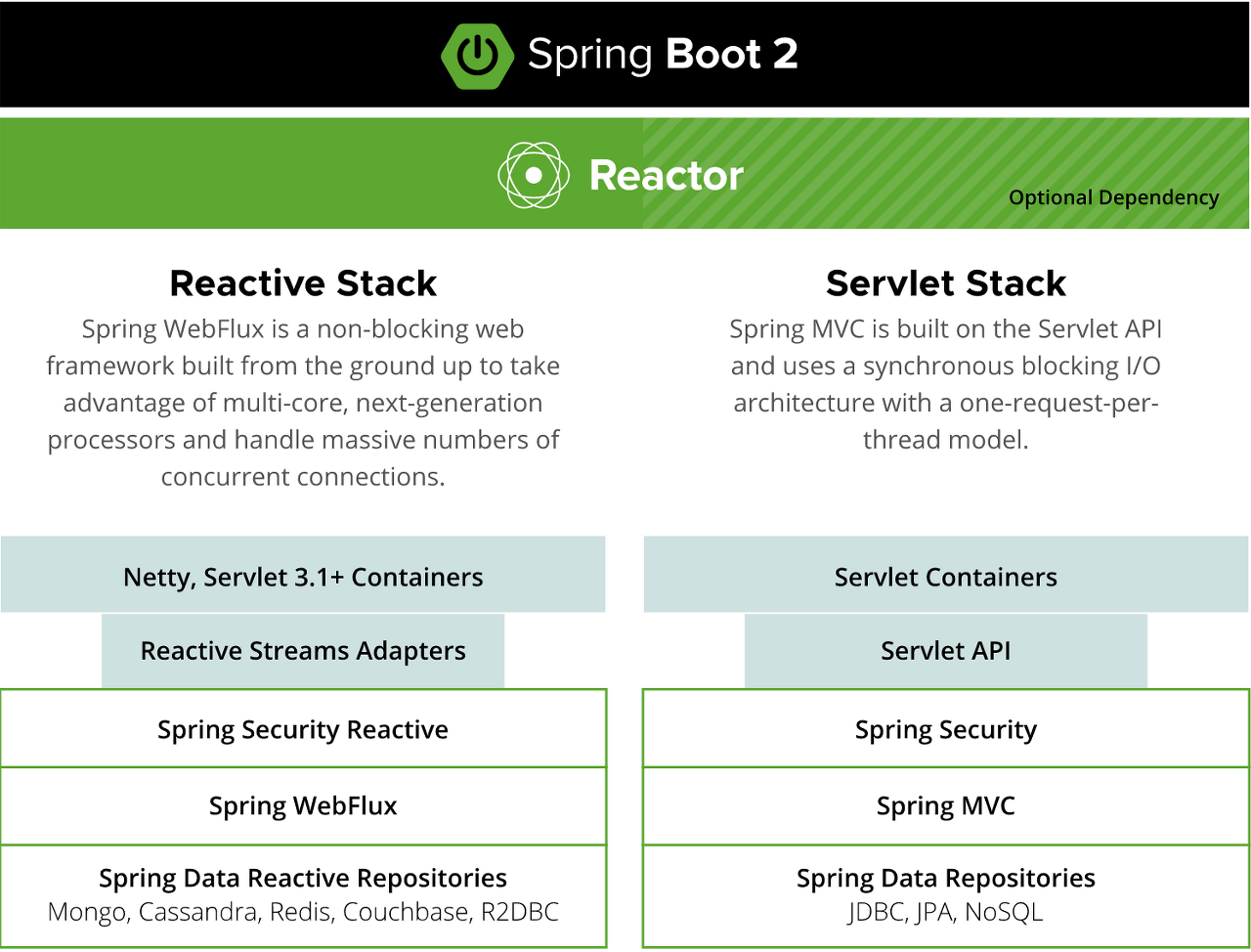 2. non-blocking 웹 스택을 생성하고자한다면, 선택 가능한 서버 (Netty, Tomcat, Jetty, Undertow 및 Servlet 3.1+ 컨테이너)를 제공하는 Spring WebFlux를 선택할 수 있습니다. 웹 엔드 포인트) 및 반응 라이브러리 (Reactor, RxJava 또는 기타)를 선택할 수 있습니다.