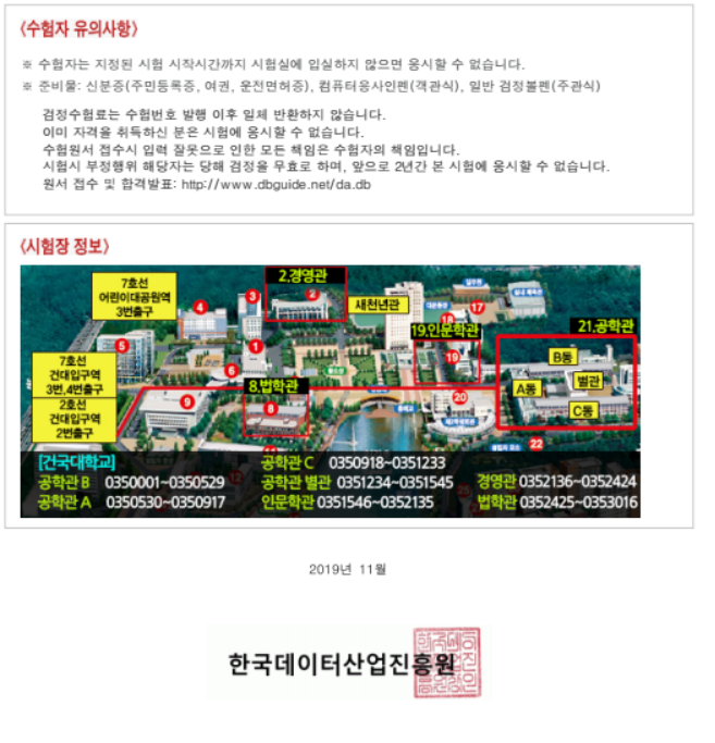 2019년 제35회 sql자격검정 서울지역 시험 장소는 건국대학교였습니다. 검색해보니 예전에는 동국대에서 많이 봤던 것 같은데 작년 4회 시험부터 건대에서도 종종 보는 것 같네요. 건대 안에서도 각각 수험번호 별로 공학관, 법학관, 인문학관, 경영관 등으로 나눠져 있으니 미리 확인하시면 좋을 것 같습니다😃