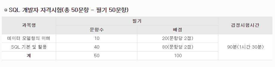 자격시험의 과목은 총 2과목으로 구성되어 있으며 데이터 모델링의 이해 과목을 바탕으로 SQL 기본 및 활용을 수행하는 능력을 검정합니다. 그리고 전체 50문제 중에 평균 8-10문제는 단답형 문항으로 출제됩니다. 이번 35회 시험에는 8문제가 단답형 유형으로 출제되었습니다.