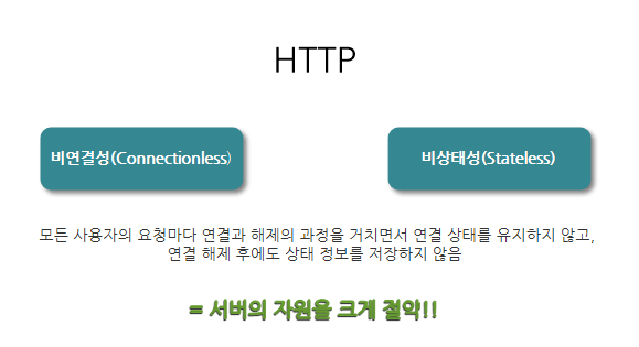 이는 서버의 자원을 절약하기 위해 모든 사용자의 요청마다 연결과 해제의 과정을 거치기 때문에 연결 상태가 유지되지 않고, 연결 해제 후에 상태 정보가 저장되지 않는다는 것입니다.