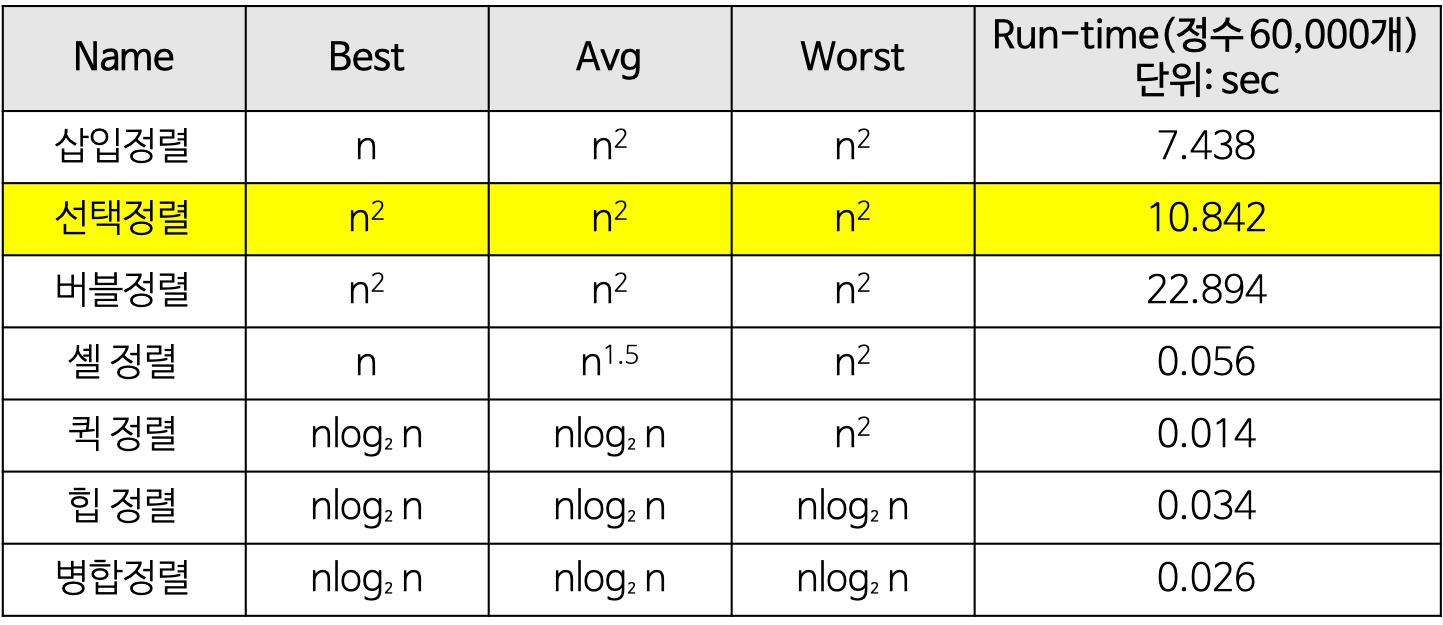 - 선택정렬은 제자리 정렬(in-place sorting) 알고리즘의 하나