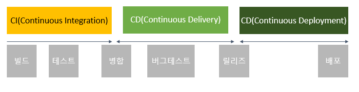 - 지속적인 통합(Continuous Integration), 지속적인 서비스 제공(Continuous Delivery), 지속적인 배포(Continuous Deployment)으로 구성