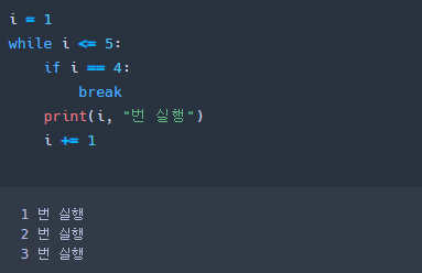 기존에 5번 실행되던 구문에서 3번 까지면 실행되고 i가 4가 되었을 때 조건을 빠져나가는 break가 실행되어 종료됩니다.