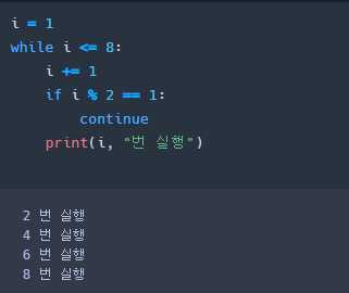 continue문에서는 해당 조건문이 true일 경우 continue문 아래의 코드는 실행되지 않고 반복문의 시작 지점으로 되돌아가서 계속 반복되게 됩니다. 즉, continue 부분의 코드는 건너뛰게 되는 것입니다. 아래 코드에서 홀수의 경우 건너뛰도록 조건을 설정하면, 반복하며 짝수에 해당하는 번호만 실행되게 됩니다.