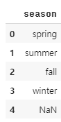 season = pd.DataFrame({'season':['spring', 'summer', 'fall', 'winter', np.nan]})
