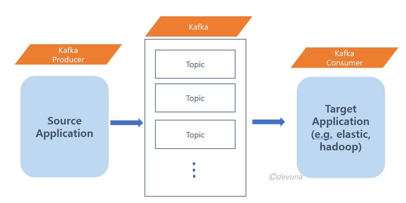 아파치 카프카는 소스 애플리케이션과 타겟 애플리케이션의 사이에 위치하여 메세지 큐의 역할을 하게 됩니다.