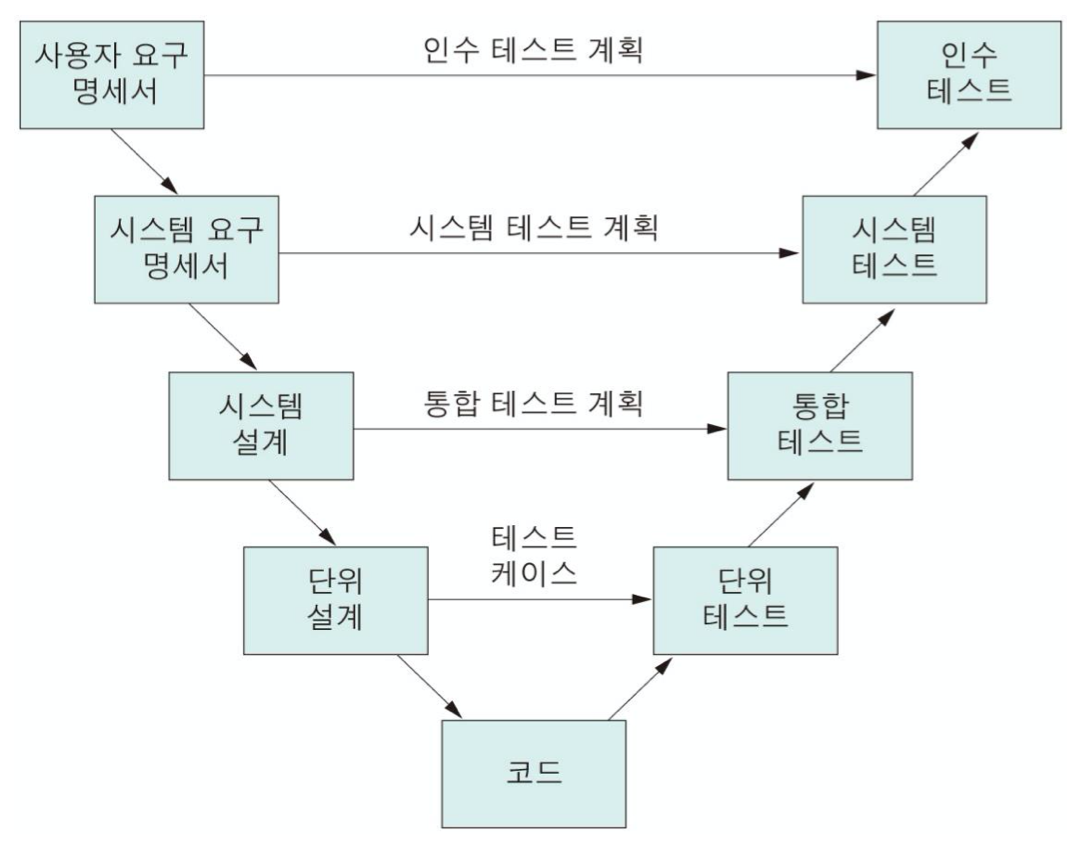 - 각 개발단계별로 상응하는 테스트 작업이 존재